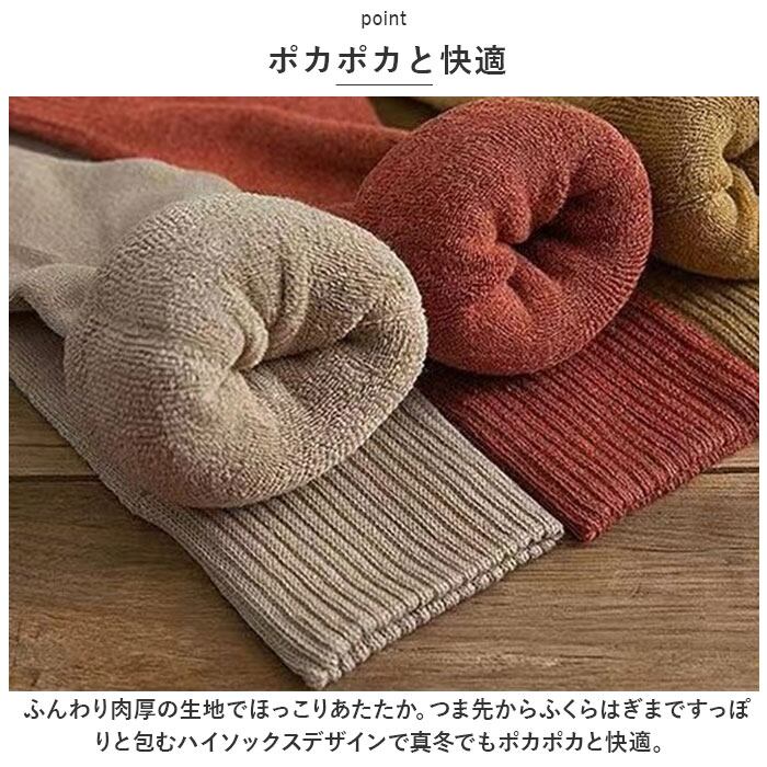 ・ふんわり肉厚の生地でほっこりあたたか。つま先からふくらはぎまですっぽりと包むハイソックスデザインで真冬でもポカポカと快適。