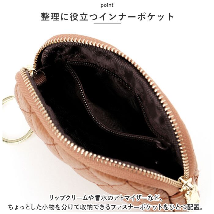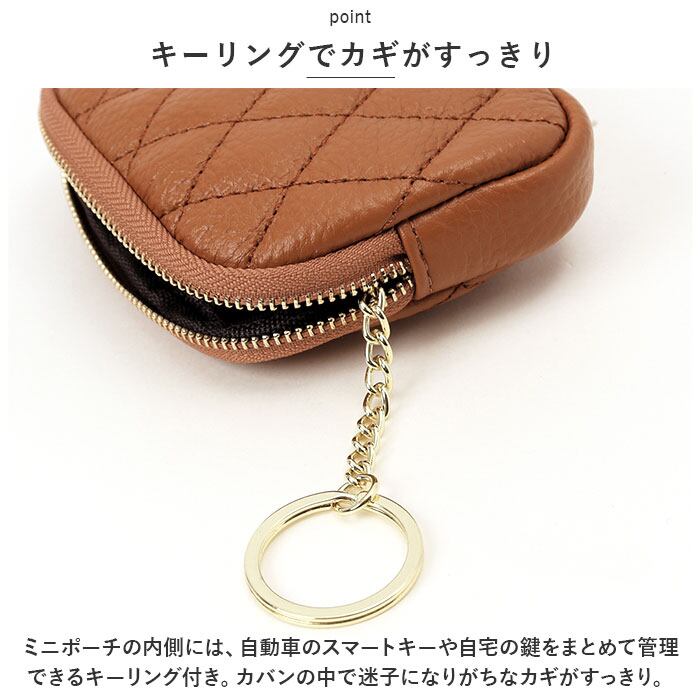 ・ミニポーチの内側には、自動車のスマートキーや自宅の鍵をまとめて管理できるキーリング付き。カバンの中で迷子になりがちなカギがすっきり。
