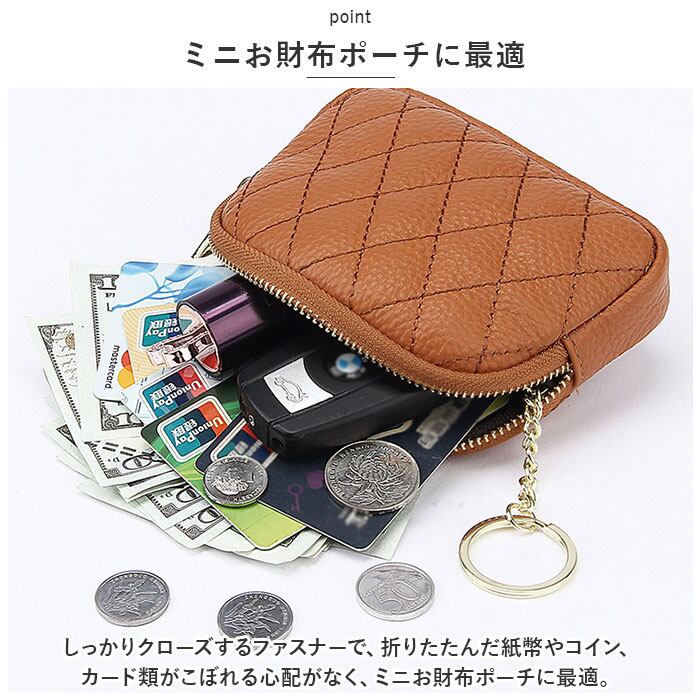 ・しっかりクローズするファスナーで、折りたたんだ紙幣やコイン、カード類がこぼれる心配がなく、ミニお財布ポーチに最適。