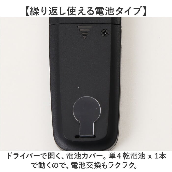 ・ドライバーで開く、電池カバー。単4乾電池 x 1本で動くので、電池交換もラクラク。