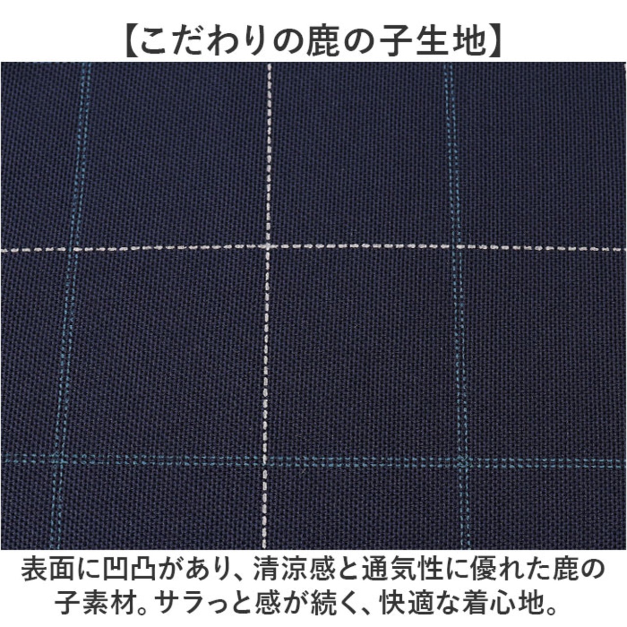 ・表面に凹凸があり、清涼感と通気性に優れた鹿の子素材。サラっと感が続く、快適な着心地。