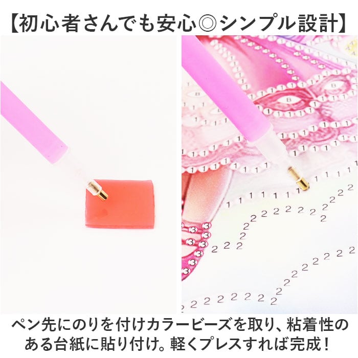 ・ペン先にのりを付けカラービーズを取り、粘着性のある台紙に貼り付け。軽くプレスすれば完成!