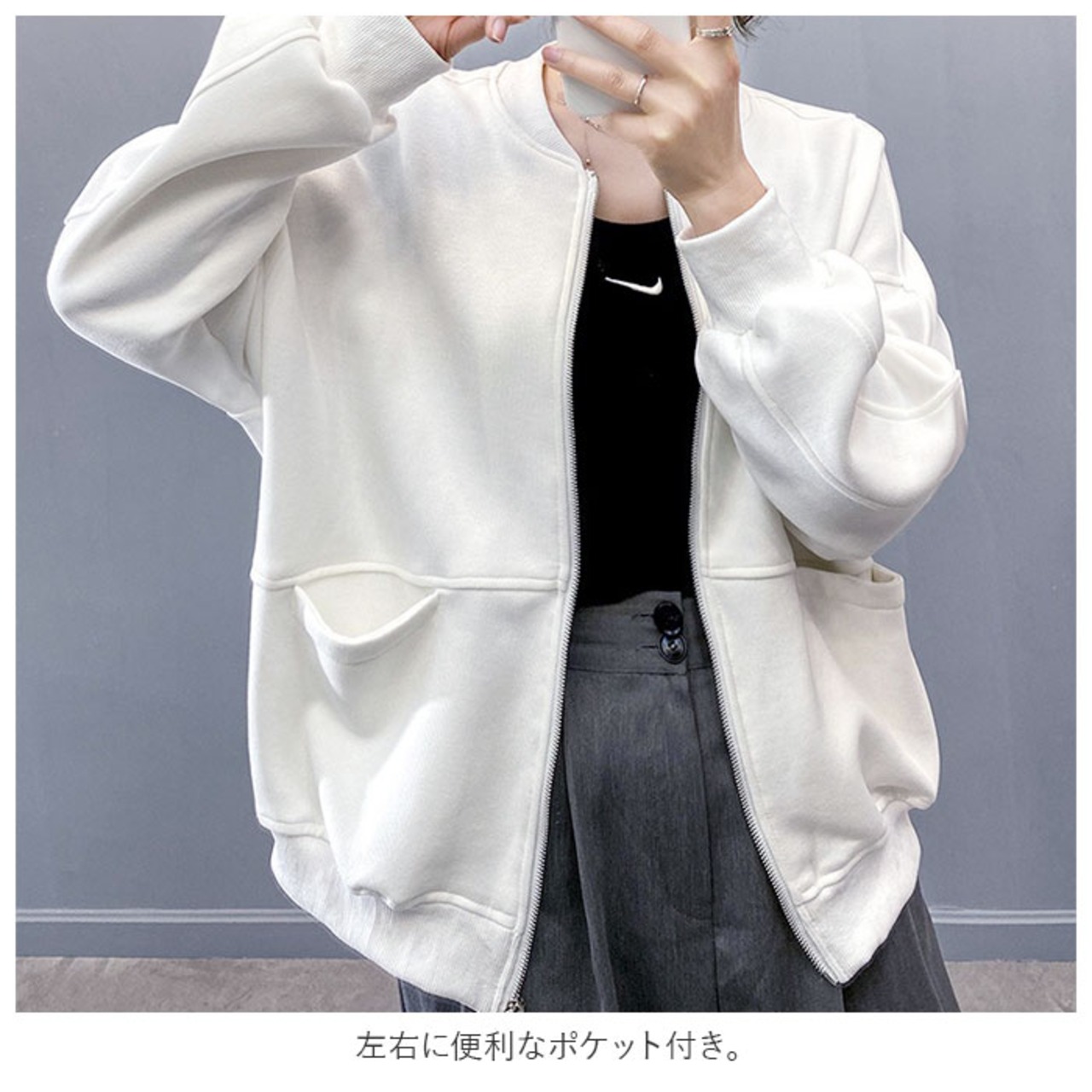 パーカー レディース 大きめ 通販 ジャケット スタジャン スウェット カーディガン トレーナー カットソー ライトコート 羽織り ファスナー ポケット 大きいサイズ ゆったり 体型カバー 大人 かわいい