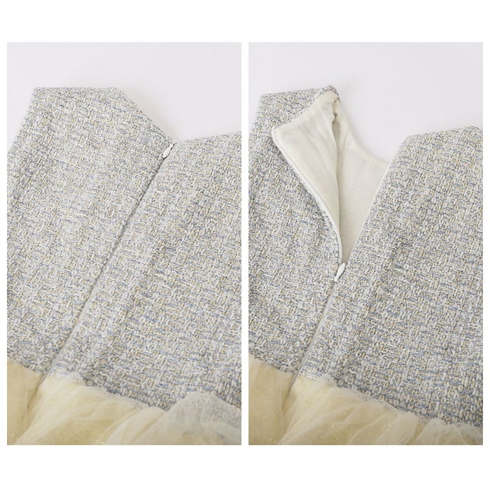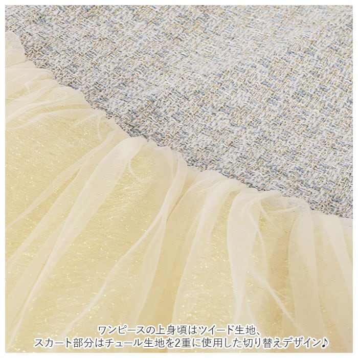 ・ワンピースの上身頃はツイード生地、スカート部分はチュール生地を2重に使用した、切り替えデザインがおしゃれ♪