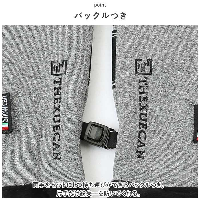 ・両手をセットにして持ち運びができるバックルつき。片手だけ紛失…を防いでくれる。