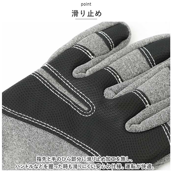 ・指先と手のひら部分に滑り止め加工を施し、ハンドルなどを握った時も滑りにくい安心の仕様。運転が快適。