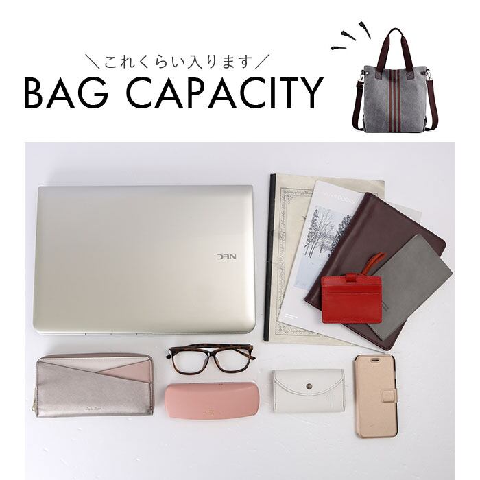 ・A4サイズやノートPCをすっぽり収納できるサイズ感。マチがしっかりとしているので、ペットボトルやお弁当など、お出かけに必要な物をしっかりと収納。
