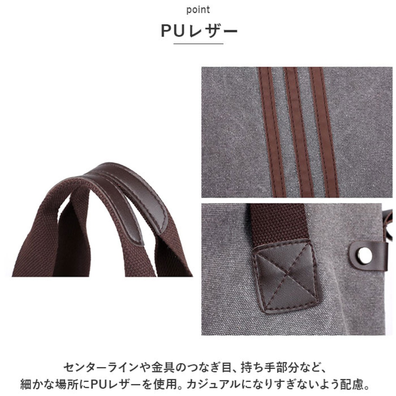 ・センターラインや金具のつなぎ目、持ち手部分など、細かな場所にPUレザーを使用。カジュアルになりすぎないよう配慮。