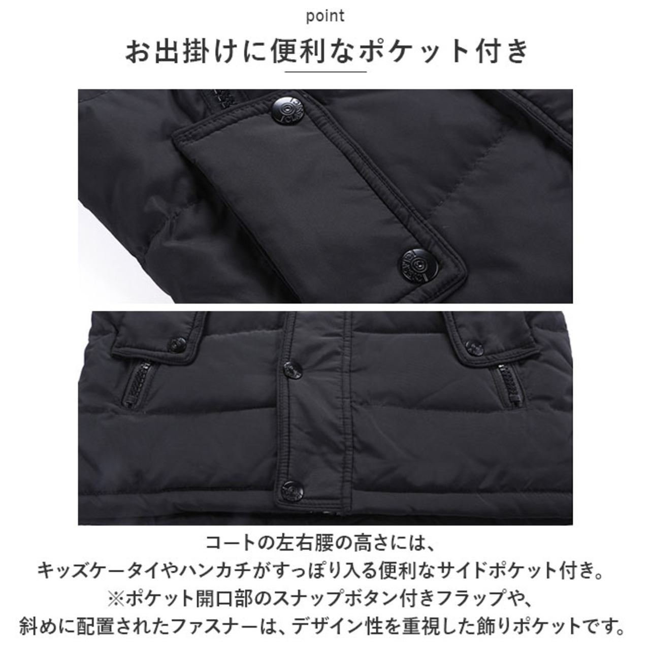 ・コートの左右腰の高さには、キッズケータイやハンカチがすっぽり入る便利なサイドポケット付き。(※ポケット開口部のスナップボタン付きフラップや、斜めに配置されたファスナーは、デザイン性を重視した飾りポケットです。)