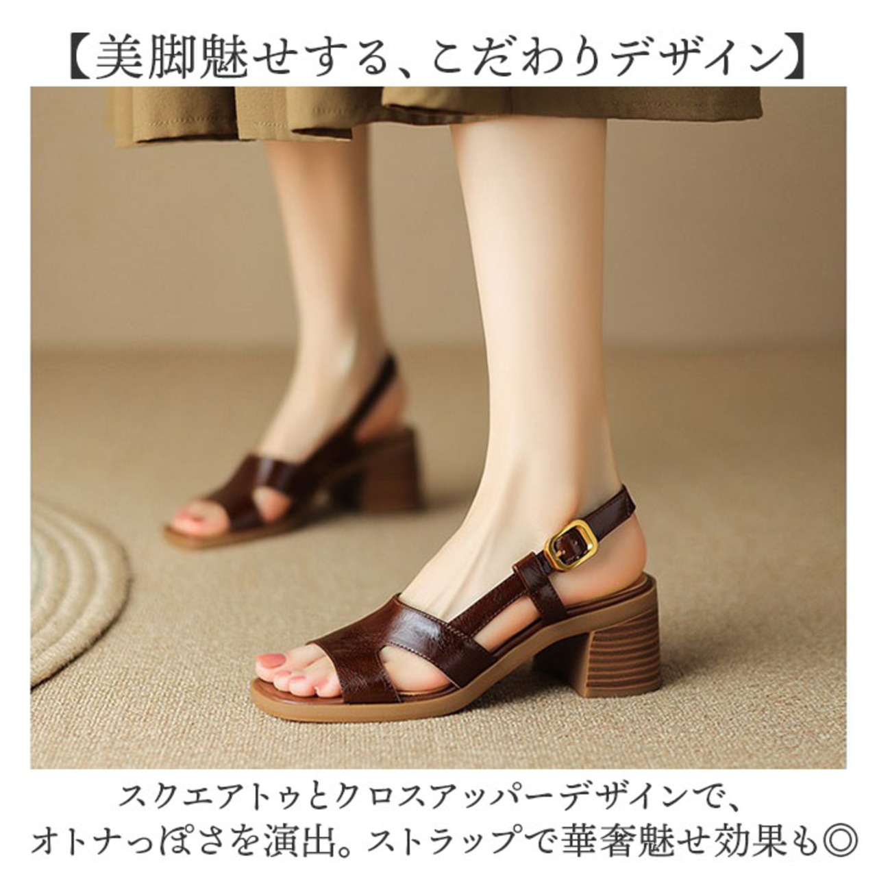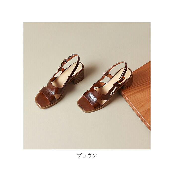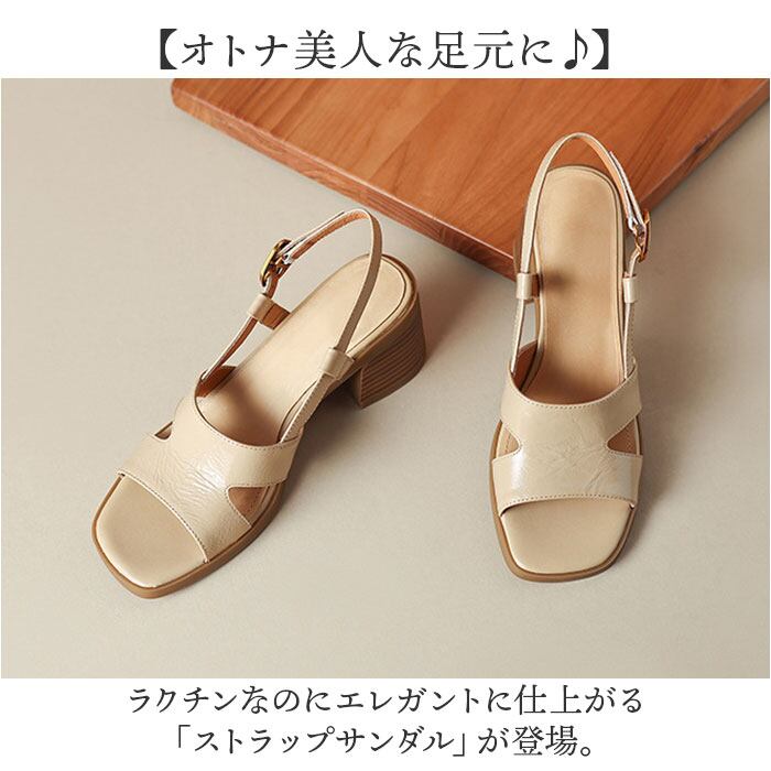 ・スクエアトゥとクロスアッパーデザインで、オトナっぽさを演出。ストラップで華奢魅せ効果も◎