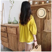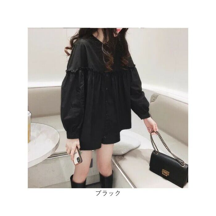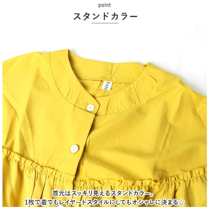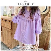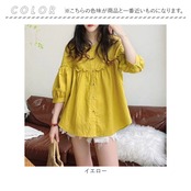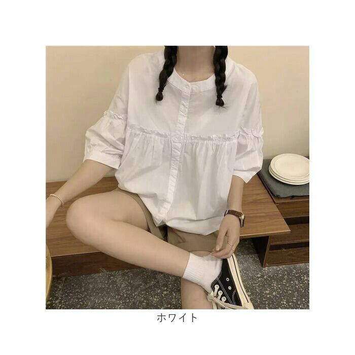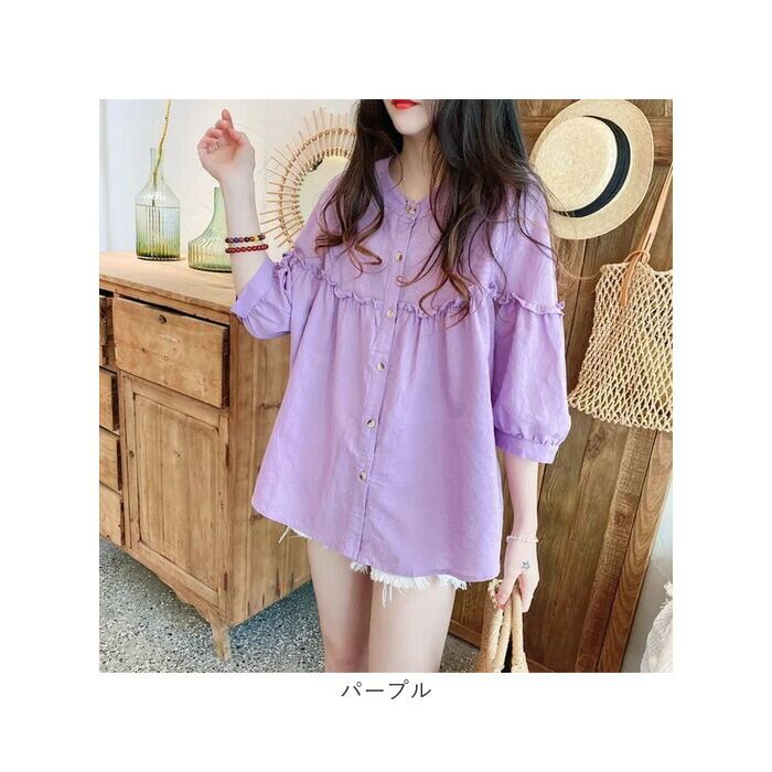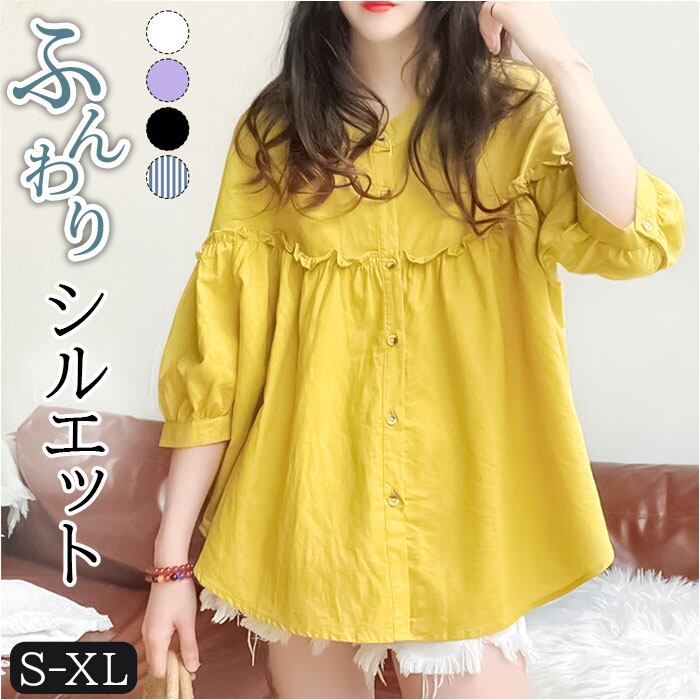シャツ ブラウス レディース 通販 シャツブラウス 七分袖 前開き ラウンドネック ゆったり 体型カバー フリル コットン 無地 切り替え トップス かわいい おしゃれ 通勤 通学