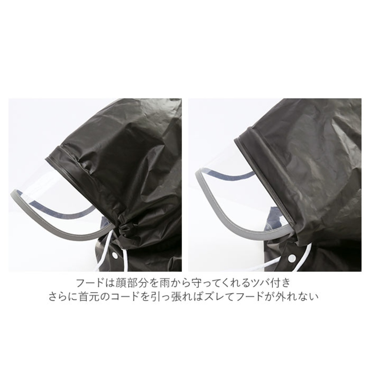 ・フードは顔部分を雨から守ってくれるツバ付き。さらに首元のコードを引っ張ればズレてフードが外れない。