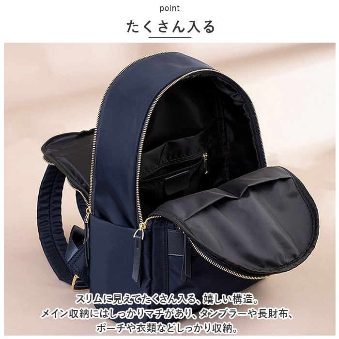 ・スリムに見えてたくさん入る、嬉しい構造。メイン収納にはしっかりマチがあり、タンブラーや長財布、ポーチや衣類などしっかり収納。