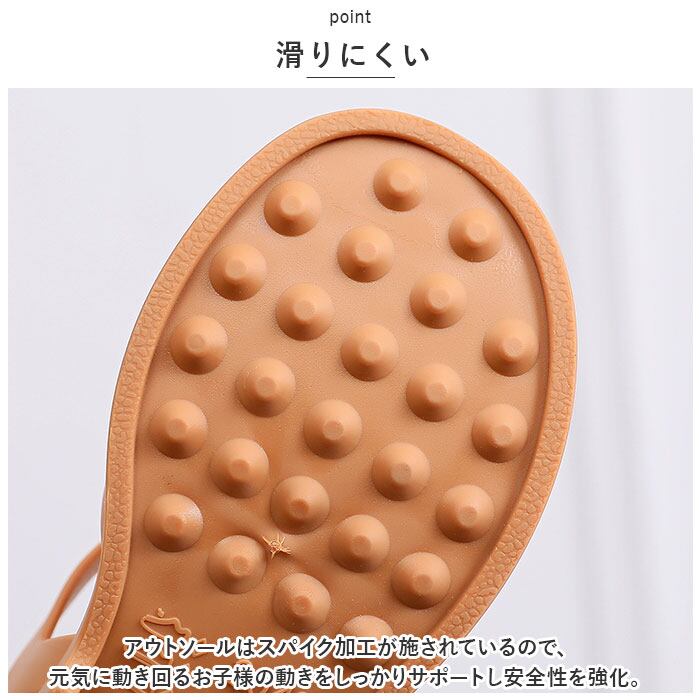 ・アウトソールはスパイク加工が施されているので、元気に動き回るお子様の動きをしっかりサポートし安全性を強化。