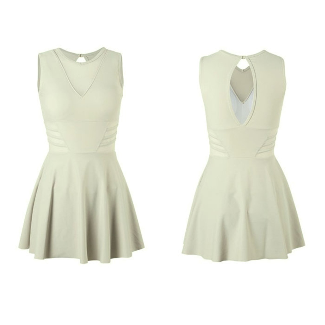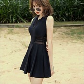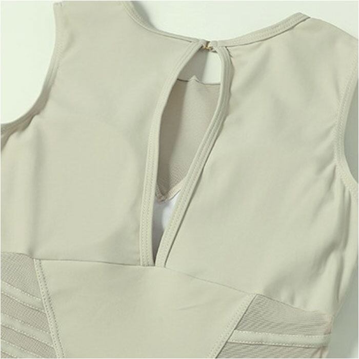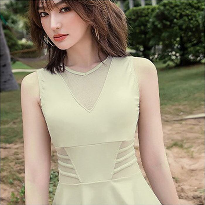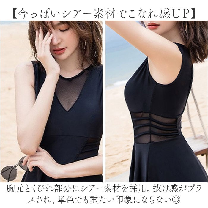 ・胸元とくびれ部分にシアー素材を採用。抜け感がプラスされ、単色でも重たい印象にならない◎