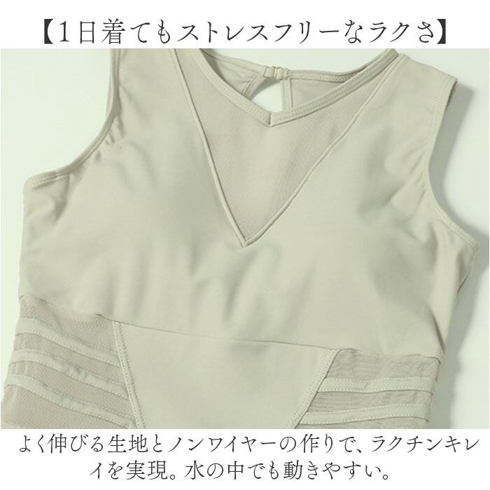 ・よく伸びる生地とノンワイヤーの作りで、ラクチンキレイを実現。水の中でも動きやすい。