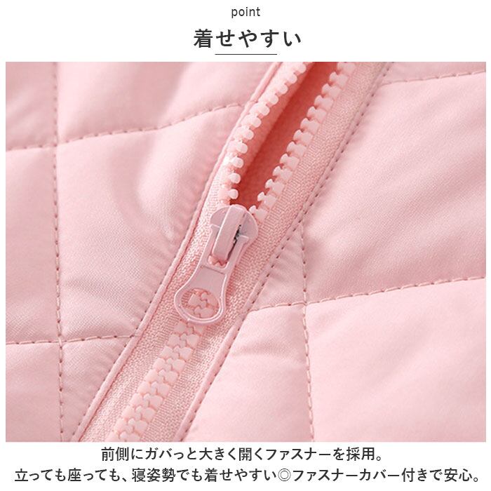 ・前側にガバっと大きく開くファスナーを採用。立っても座っても、寝姿勢でも着せやすい◎ファスナーカバー付きで安心。