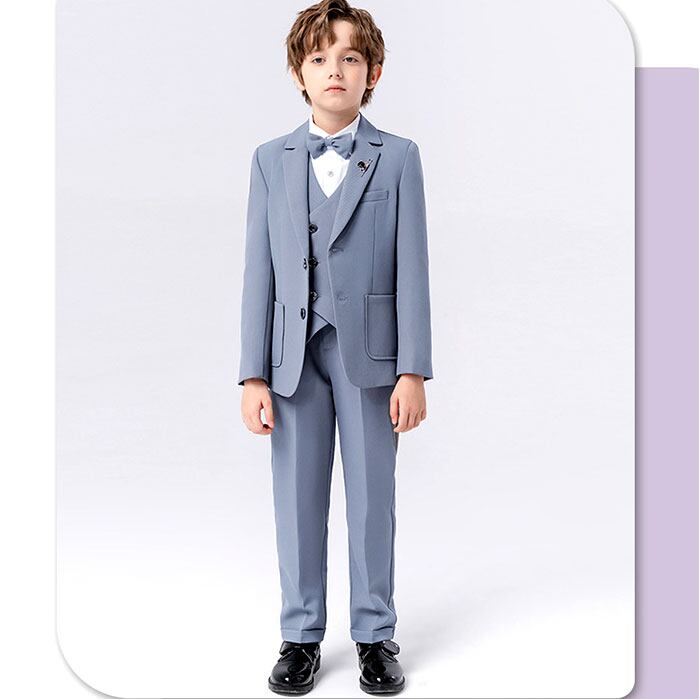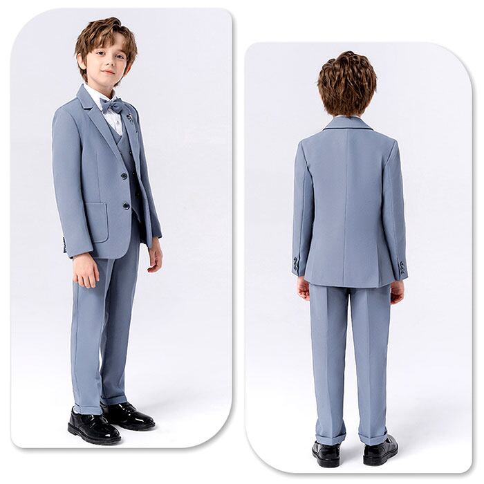 ・ジャケット、ベスト、長袖シャツ、ロングパンツ、蝶ネクタイ、ピンズの5点セット。大人顔負けのかっこいいスタイリングが完成☆