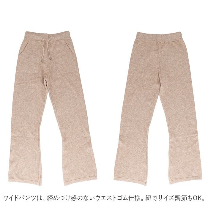 ・ワイドパンツは、締めつけ感のないウエストゴム仕様。紐でサイズ調節もOK。