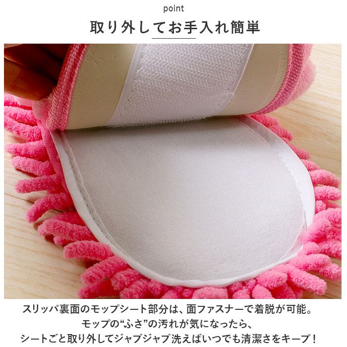 ・スリッパ裏面のモップシート部分は、面ファスナーで着脱が可能。モップの“ふさ”の汚れが気になったら、シートごと取り外してジャブジャブ洗えばいつでも清潔さをキープ!