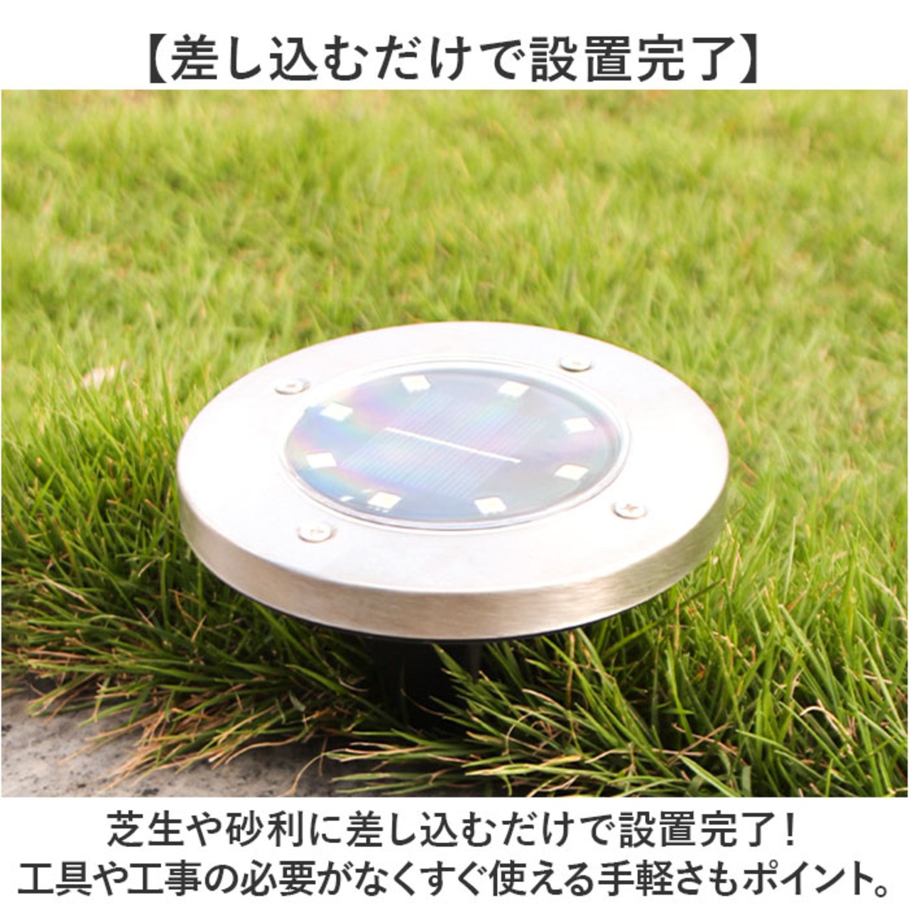 ・芝生や砂利に差し込むだけで設置完了!工具や工事の必要がなくすぐ使える手軽さもポイント。