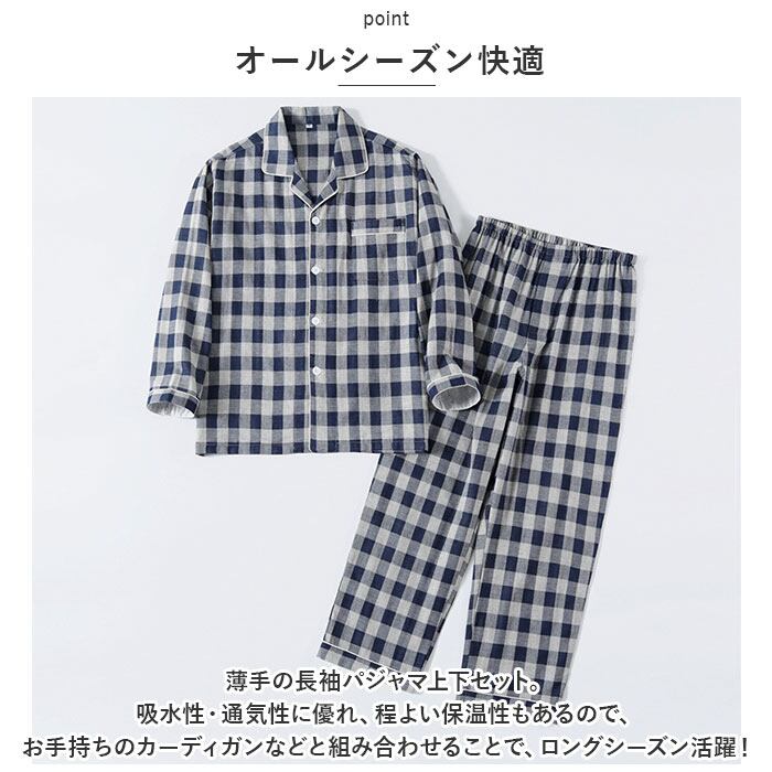 ・薄手の長袖パジャマ上下セット。吸水性・通気性に優れ、程よい保温性もあるので、寒い時期はお手持ちのカーディガンなどと組み合わせることで、ロングシーズン活躍!