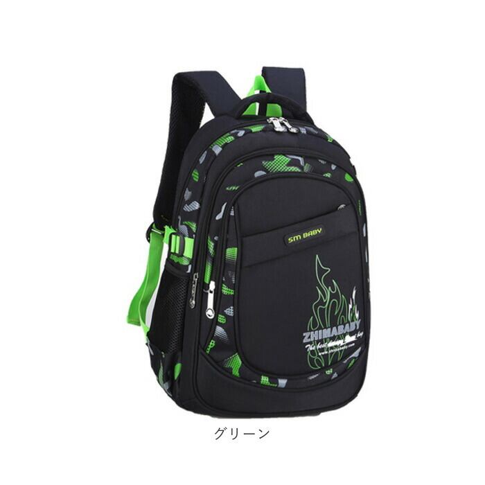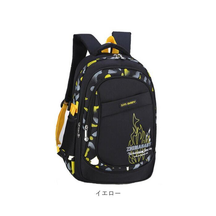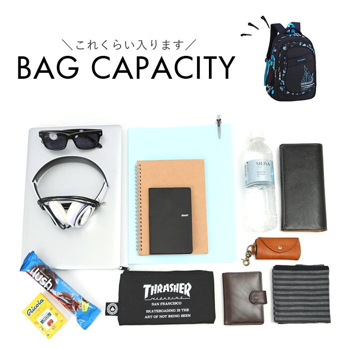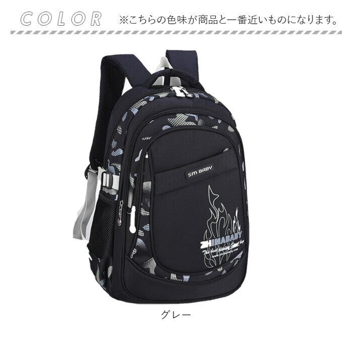 ・ブラックカラーのリュックにプリント柄をプラスした、落ち着きのあるデザイン。上部には持ち手付き。