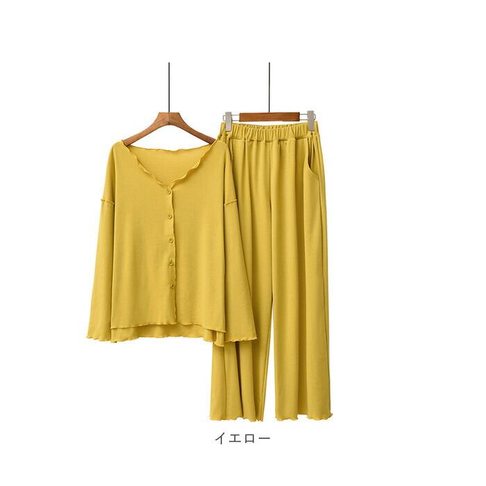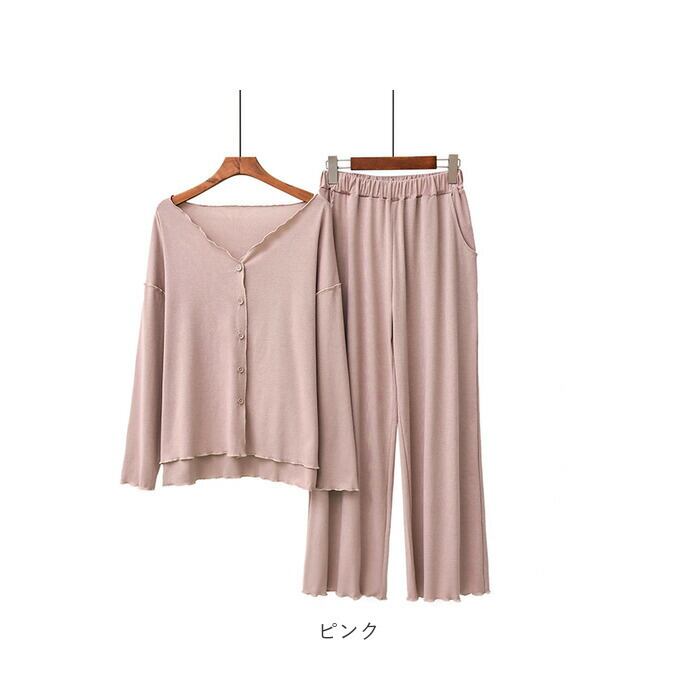 ルームウェア レディース 長袖 通販 2点セット セットアップ ゆったり とろみ パンツ ズボン 前開き ボタン 肌ざわり 柔らかい 着心地 きれいめ 無地 シンプル 春 夏 オールシーズン ルームウエア 部屋着 上下セット パジャマ ナイトウェア