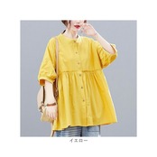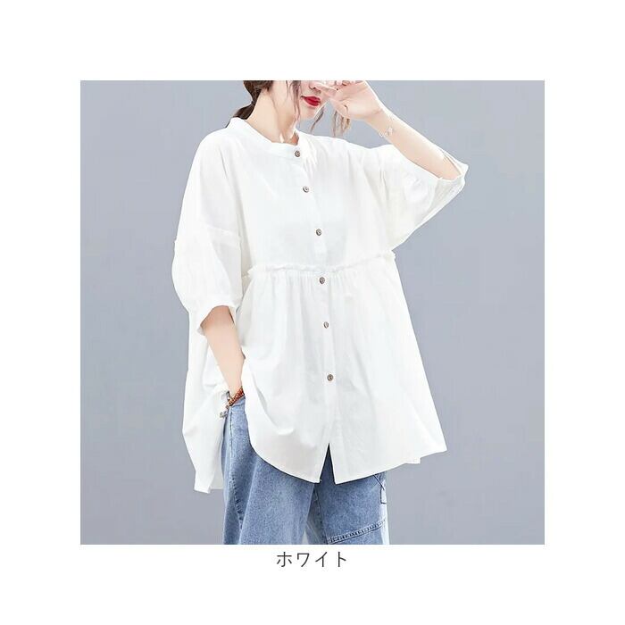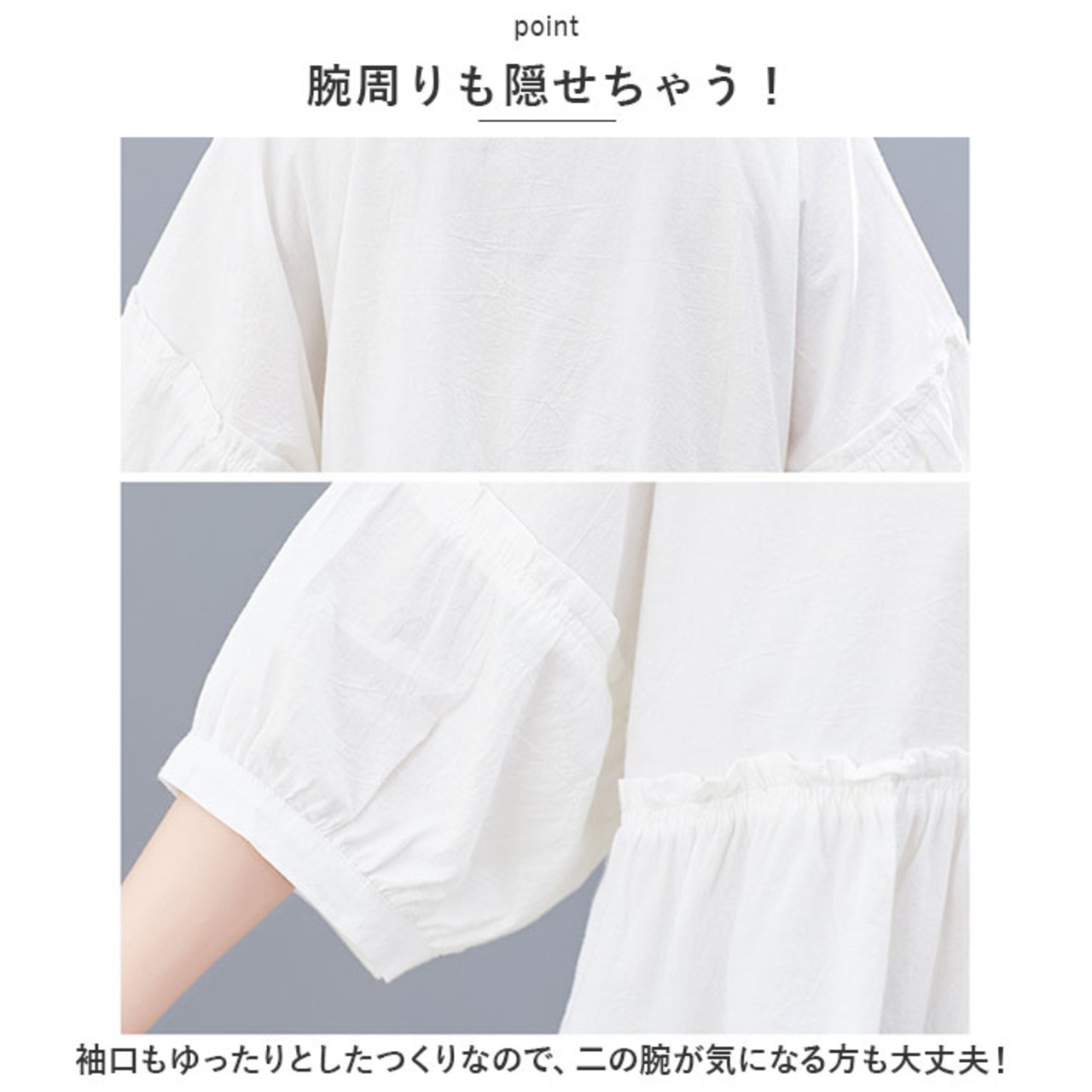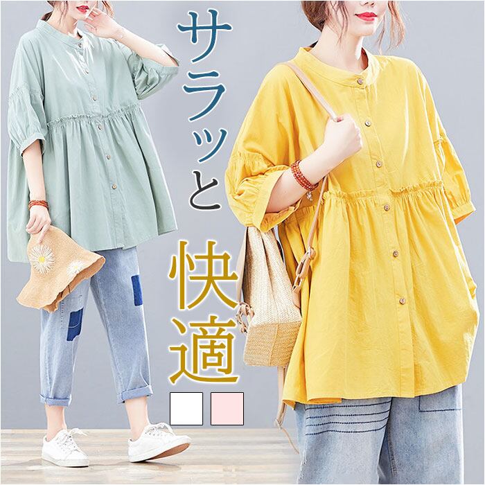 シャツ ブラウス レディース ロング 通販 シャツブラウス ロングシャツ 前開き 七分袖 ラウンドネック ゆったり 体型カバー フリル コットン 無地 切り替え トップス かわいい おしゃれ 通勤 通学