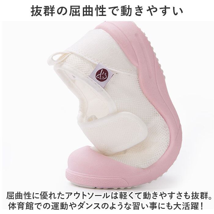 ・屈曲性に優れたアウトソールは軽くて動きやすさも抜群。体育館での運動やダンスのような習い事にも大活躍!