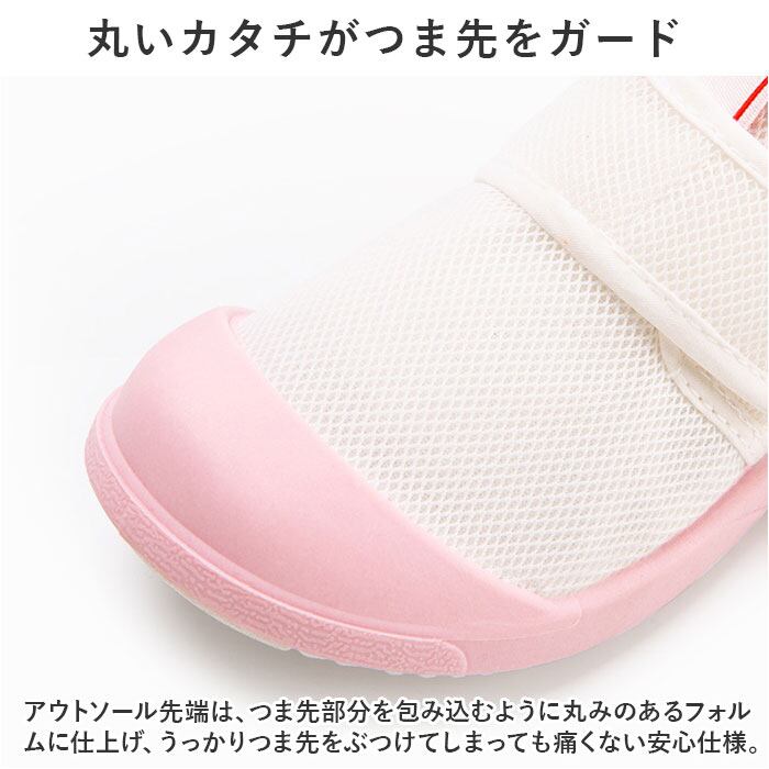 ・アウトソール先端は、つま先部分を包み込むように丸みのあるフォルムに仕上げ、うっかりつま先をぶつけてしまっても痛くない安心仕様。