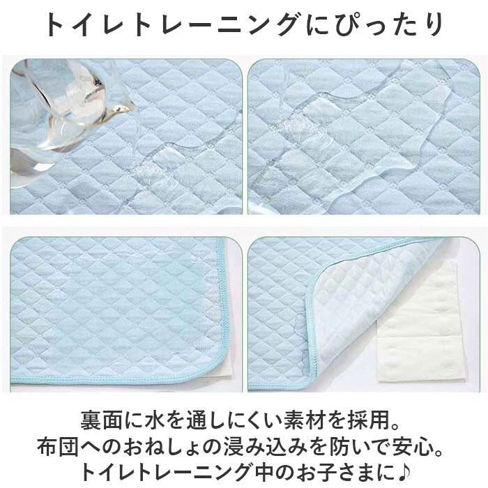 ・裏面に水を通しにくい素材を採用。布団へのおねしょの浸み込みを防いで安心。トイレトレーニング中のお子さまに♪