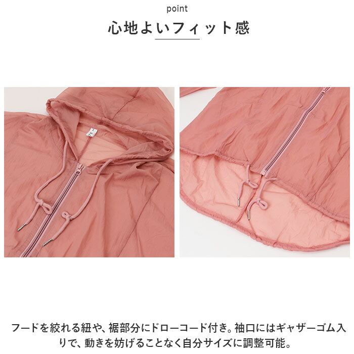 ・フードを絞れる紐や、裾部分にドローコード付き。袖口にはギャザーゴム入りで、動きを妨げることなく自分サイズに調整可能。
