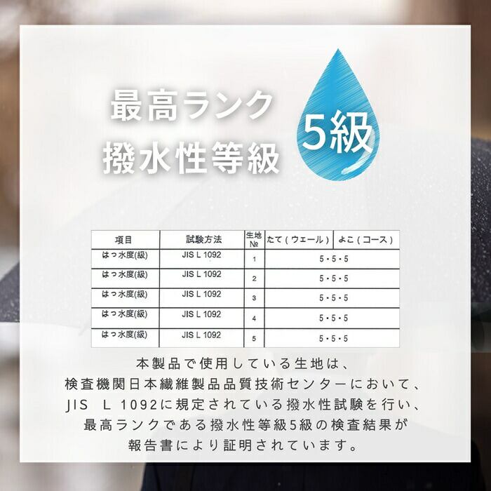 ・撥水最高等級5級の傘生地。雨粒もサッと弾いて、お天気の急変にも対応。