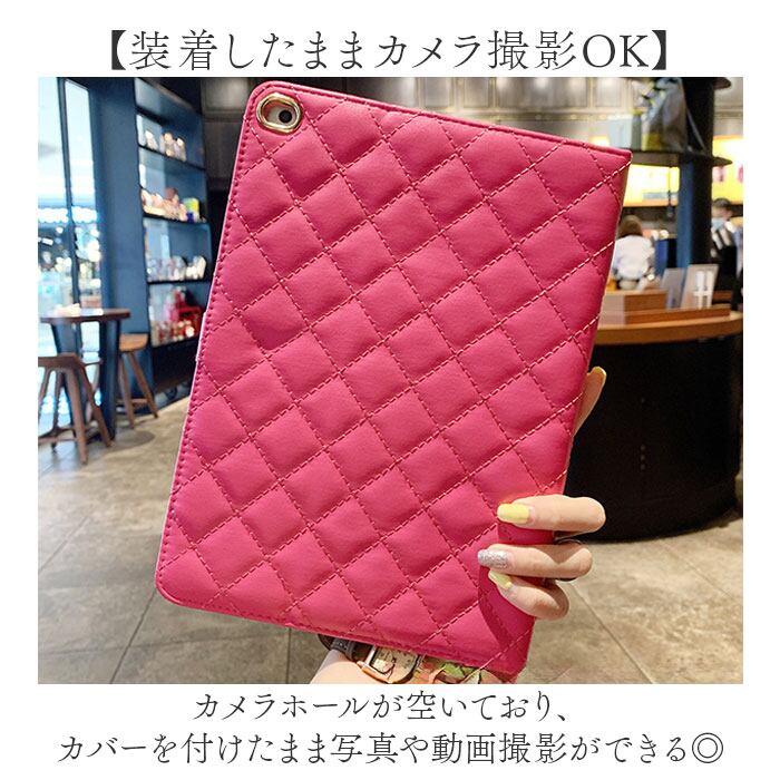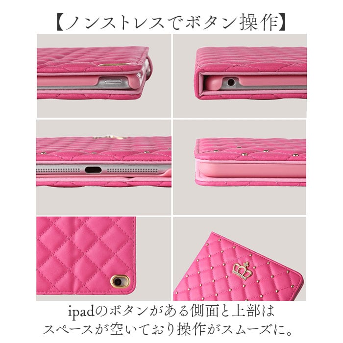 ・幅広いipad機種に対応!キルティングデザインとゴールドパーツが可愛いipadケース。