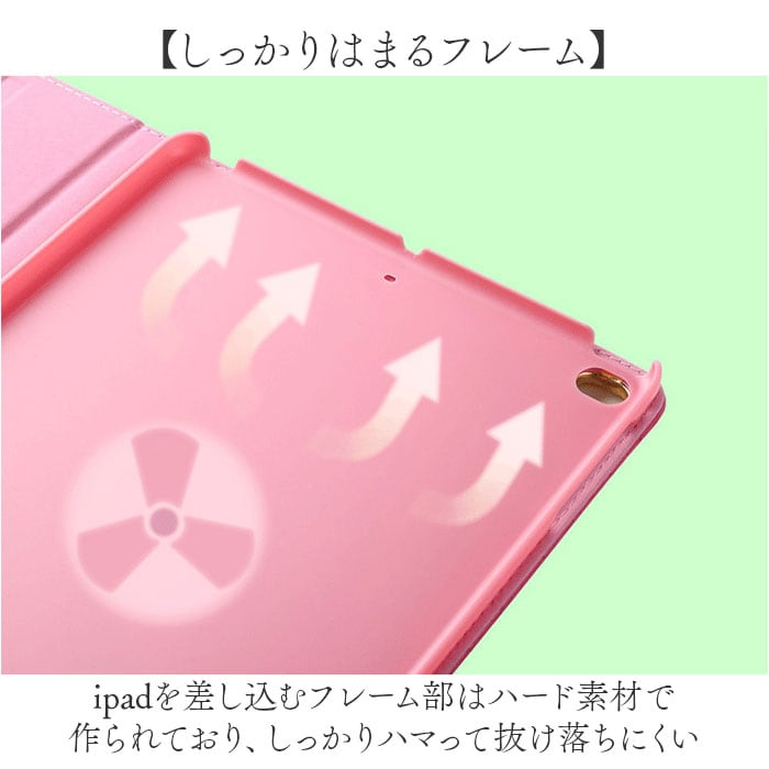 ・ipadを差し込むフレーム部はハード素材で作られており、しっかりハマって抜け落ちにくい