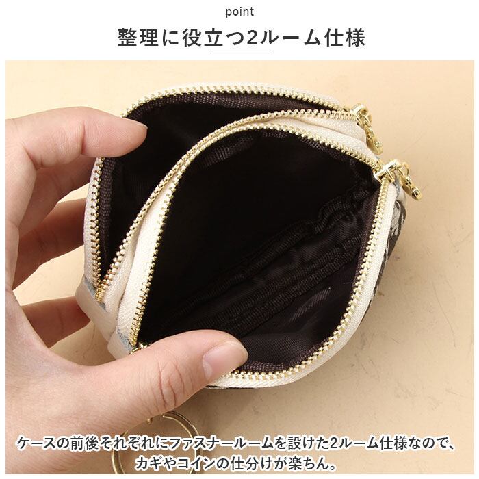 ・ケースの前後それぞれにファスナールームを設けた2ルーム仕様なので、カギやコインの仕分けが楽ちん。