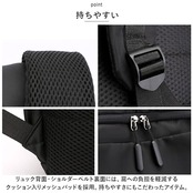 ・リュック背面・ショルダーベルト裏面には、肩への負担を軽減するクッション入りメッシュパッドを採用。持ちやすさにもこだわったアイテム。