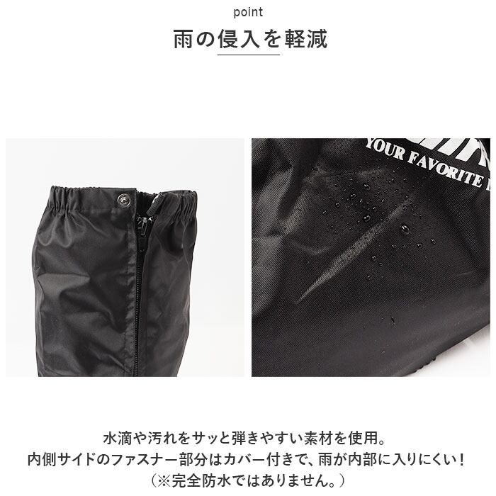 ・水滴や汚れをサッと弾きやすい素材を使用。内側サイドのファスナー部分はカバー付きで、雨が内部に入りにくい!(※完全防水ではありません。)