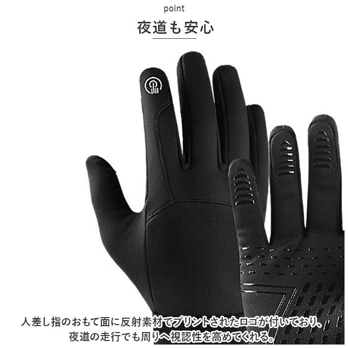 ・人差し指のおもて面に反射素材でプリントされたロゴが付いており、夜道の走行でも周りへ視認性を高めてくれる。
