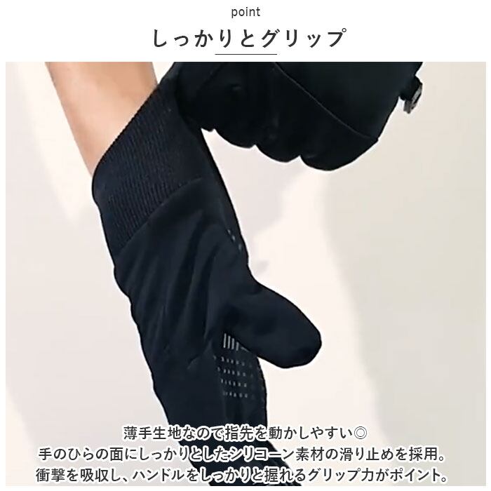 ・薄手生地なので指先を動かしやすい◎手のひらの面にしっかりとしたシリコーン素材の滑り止めを採用。衝撃を吸収し、ハンドルをしっかりと握れるグリップ力がポイント。