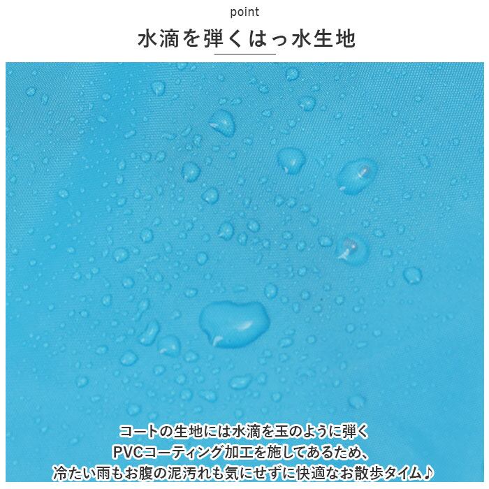 ・コートの生地には水滴を玉のように弾くPVCコーティング加工を施してあるため、冷たい雨もお腹の泥汚れも気にせずに快適なお散歩タイム♪
