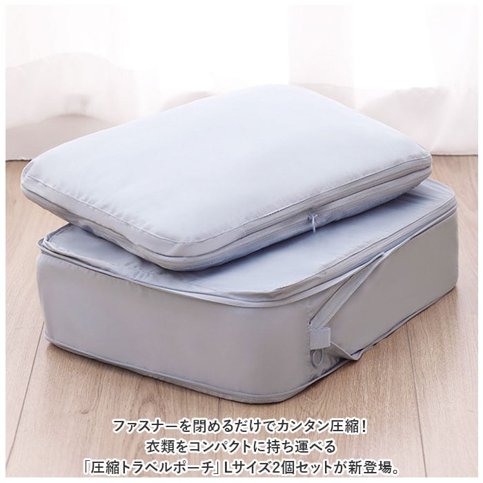 ・ファスナーを閉めるだけでカンタン圧縮!衣類をコンパクトに持ち運べる「圧縮トラベルポーチ」Lサイズ2個セットが新登場。