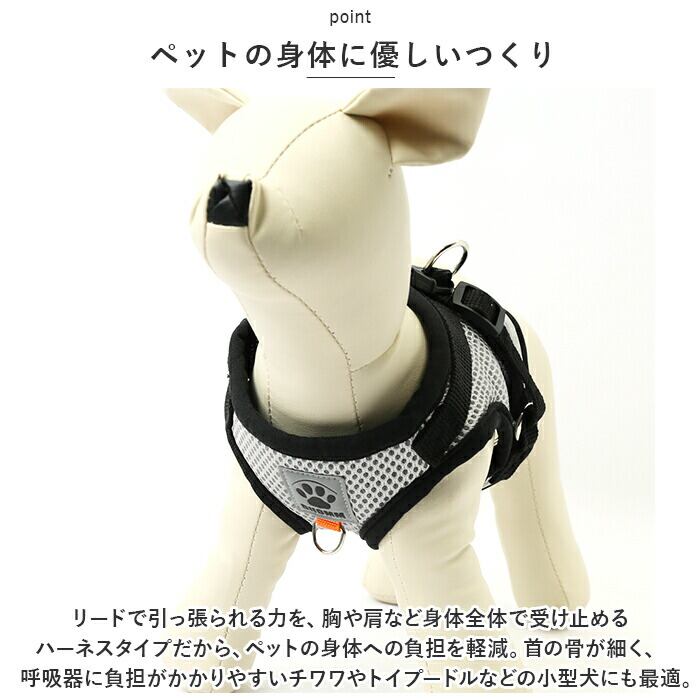 ・リードで引っ張られる力を、胸や肩など身体全体で受け止めるハーネスタイプだから、ペットの身体への負担を軽減。首の骨が細く、呼吸器に負担がかかりやすいチワワやトイプードルなどの小型犬にも最適。