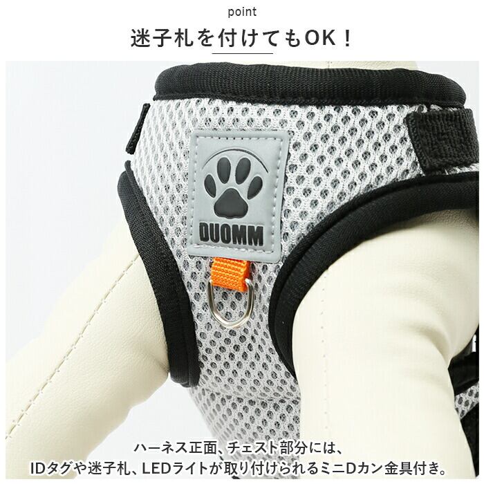 ・ハーネス正面、チェスト部分には、IDタグや迷子札、LEDライトが取り付けられるミニDカン金具付き。