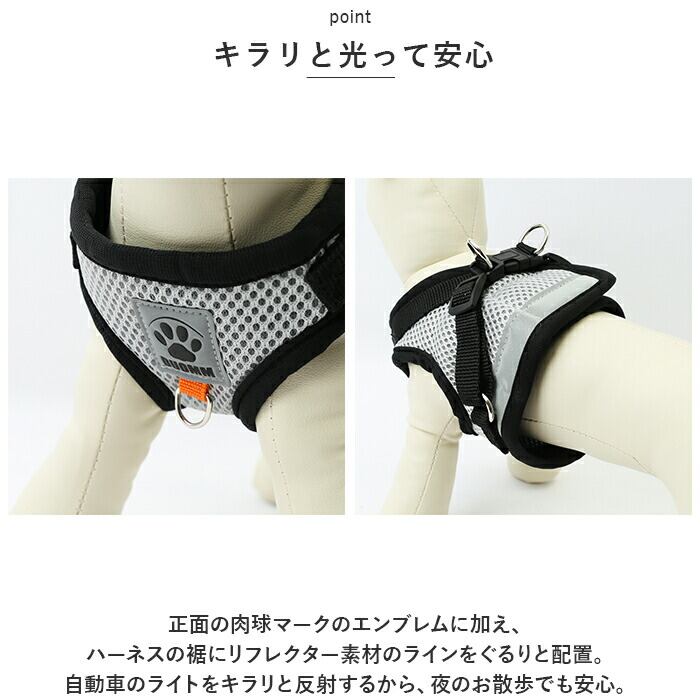 ・正面の肉球マークのエンブレムに加え、ハーネスの裾にリフレクター素材のラインをぐるりと配置。自動車のライトをキラリと反射するから、夜のお散歩でも安心。