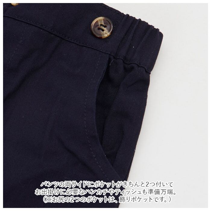 ・パンツの両サイドにポケットがきちんと2つ付いて、お出掛けに必要なハンカチやティッシュも準備万端。(※お尻の2つのポケットは、飾りポケットです。)