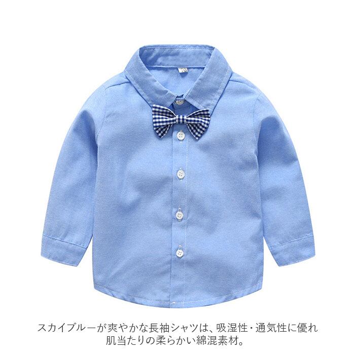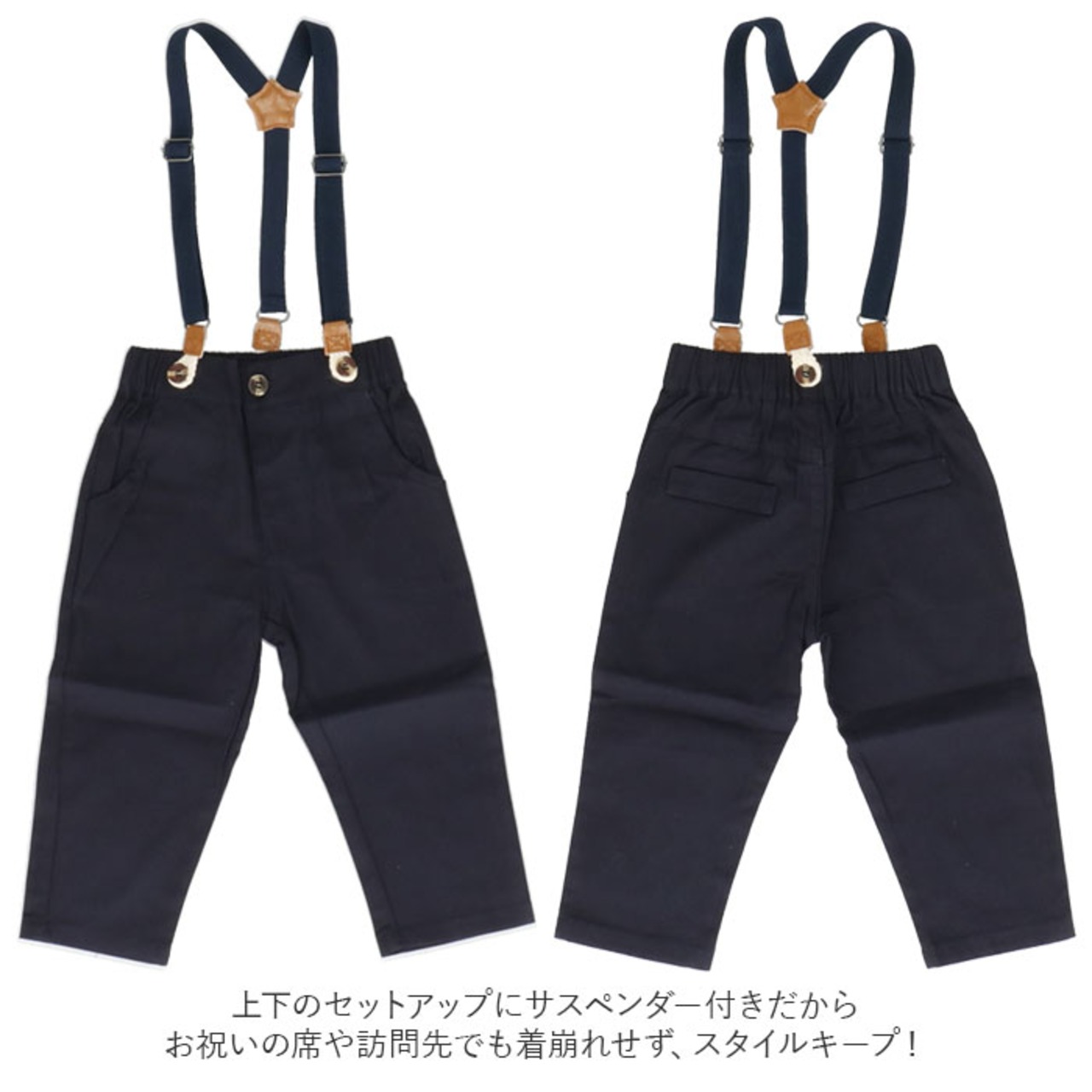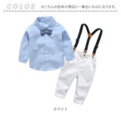 ・長袖シャツとコットンパンツに、サスペンダーを合わせた男の子用のフォーマル3点セット。