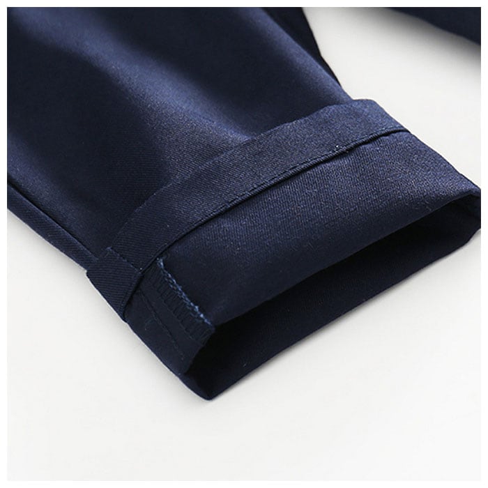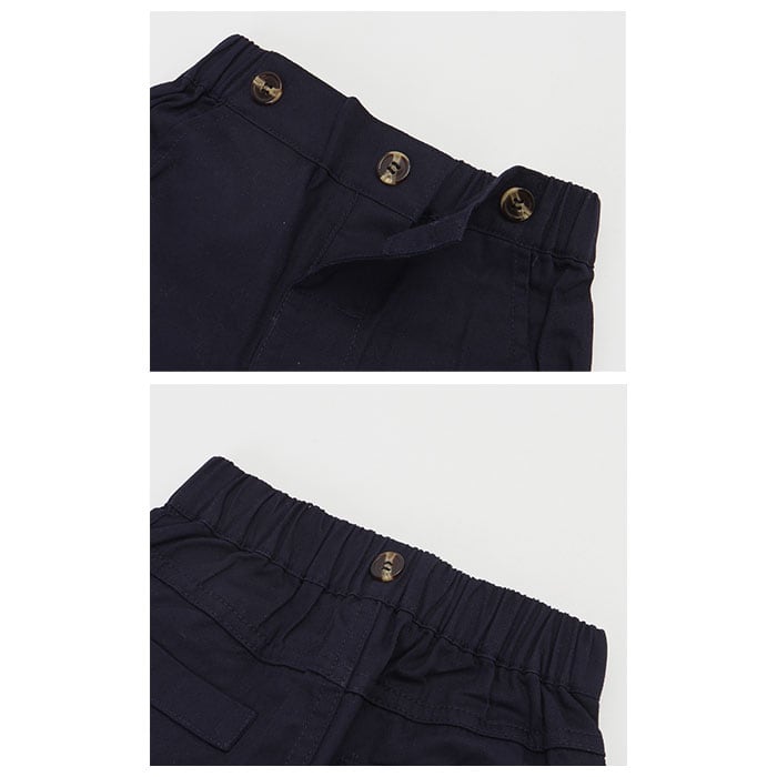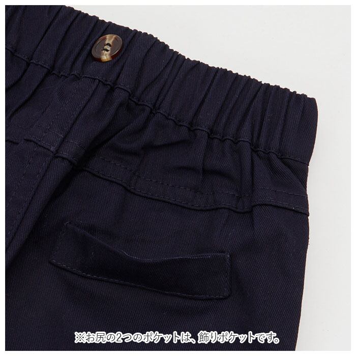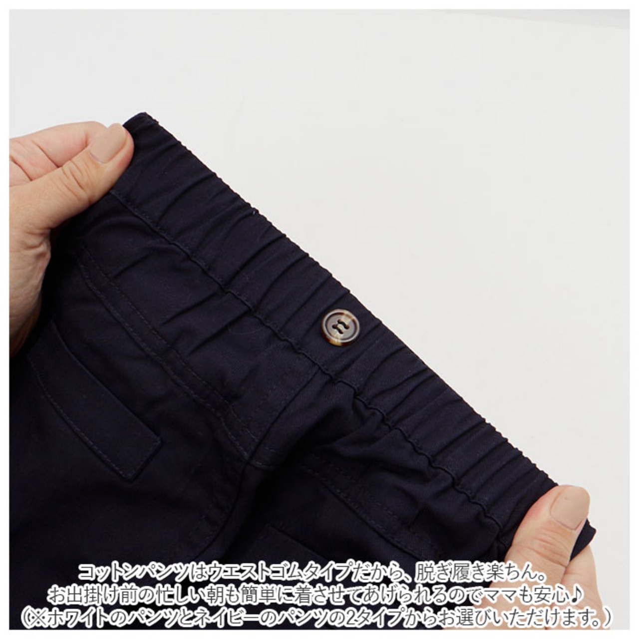 ・コットンパンツはウエストゴムタイプだから、脱ぎ履き楽ちん。お出掛け前の忙しい朝も、簡単に着させてあげられるのでママも安心♪(※ホワイトのパンツとネイビーのパンツの2タイプからお選びいただけます。)