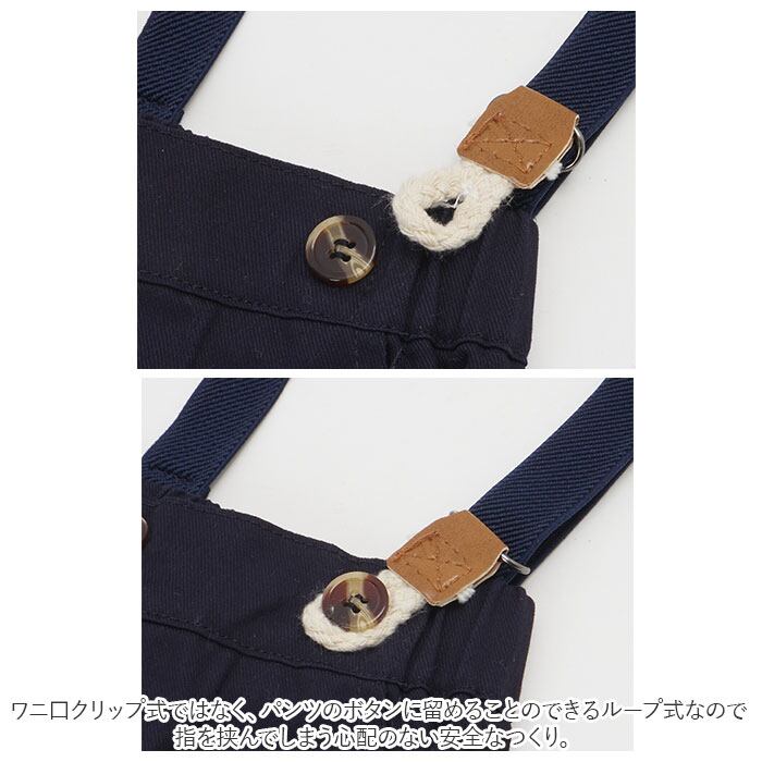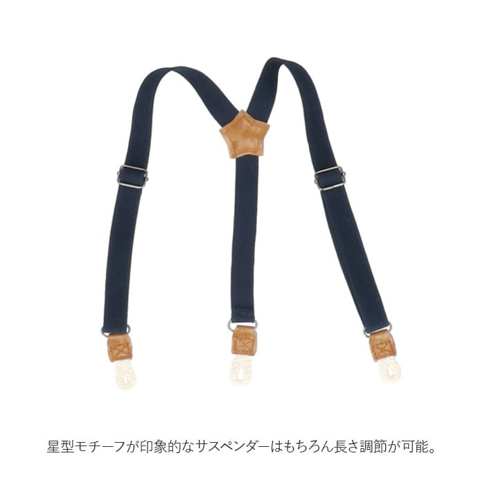 ・星型モチーフが印象的なサスペンダーはもちろん長さ調節が可能。ワニ口クリップ式ではなく、パンツのボタンに留めることのできるループ式なので、指を挟んでしまう心配のない安全なつくり。